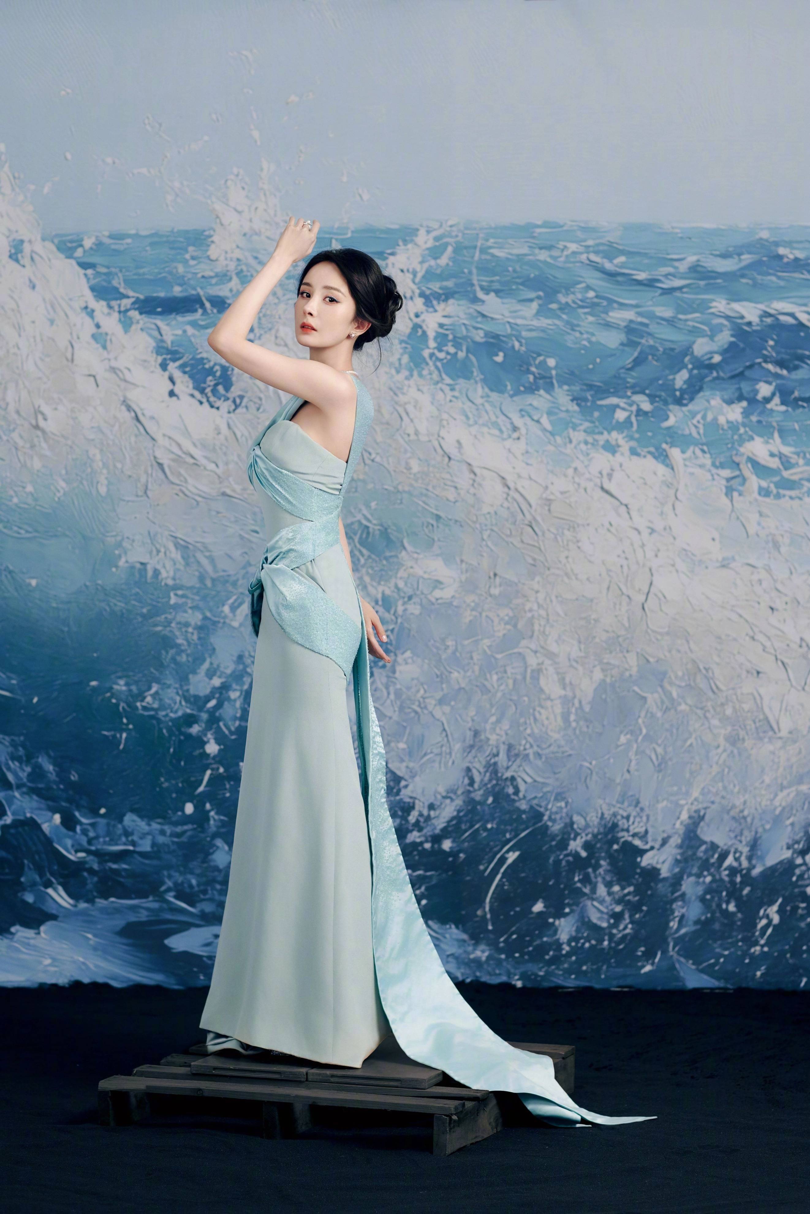 一袭冰蓝色长裙,仿佛与海浪融为一体,杨幂一出场就把人带进了氛围大片里。💙